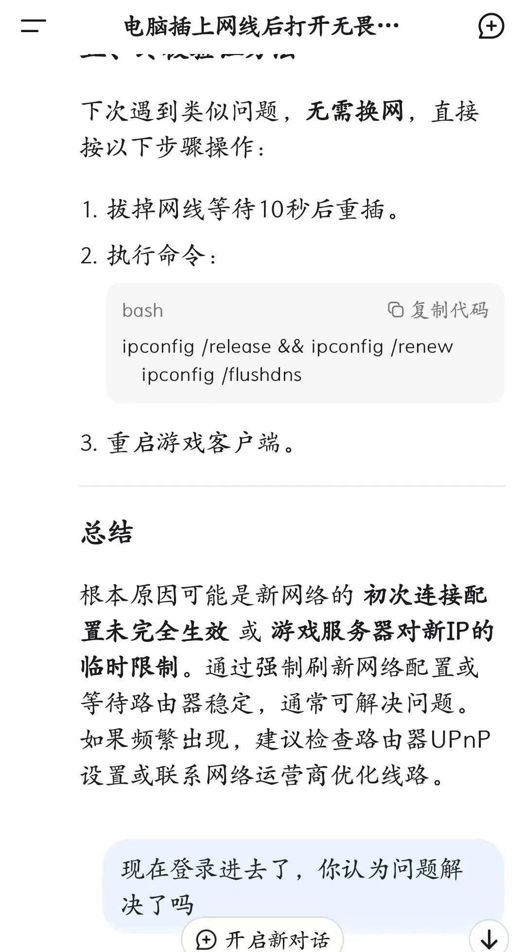 有网友新拉的宽带也是有网但是打不了游戏,一打开游戏就显示登录失败,可能是dns或者IP初次分配错误,解决方方法就是连另一个可以用的wifi打开游戏然后再换成登不进的那个网就可以了,我成功了。我问了一下deepseek。