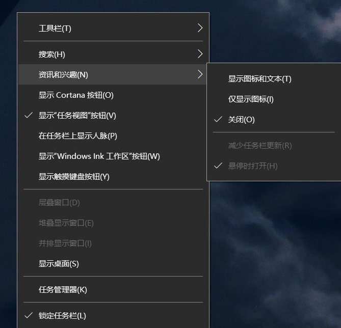 首先,若任务栏还能临时使用,直接任务栏右键选择尝试临时关闭Windows 10的“咨讯和兴趣”功能,选择关闭。